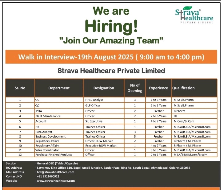 Strava Healthcare- Walk In Interview on 19th August 2025