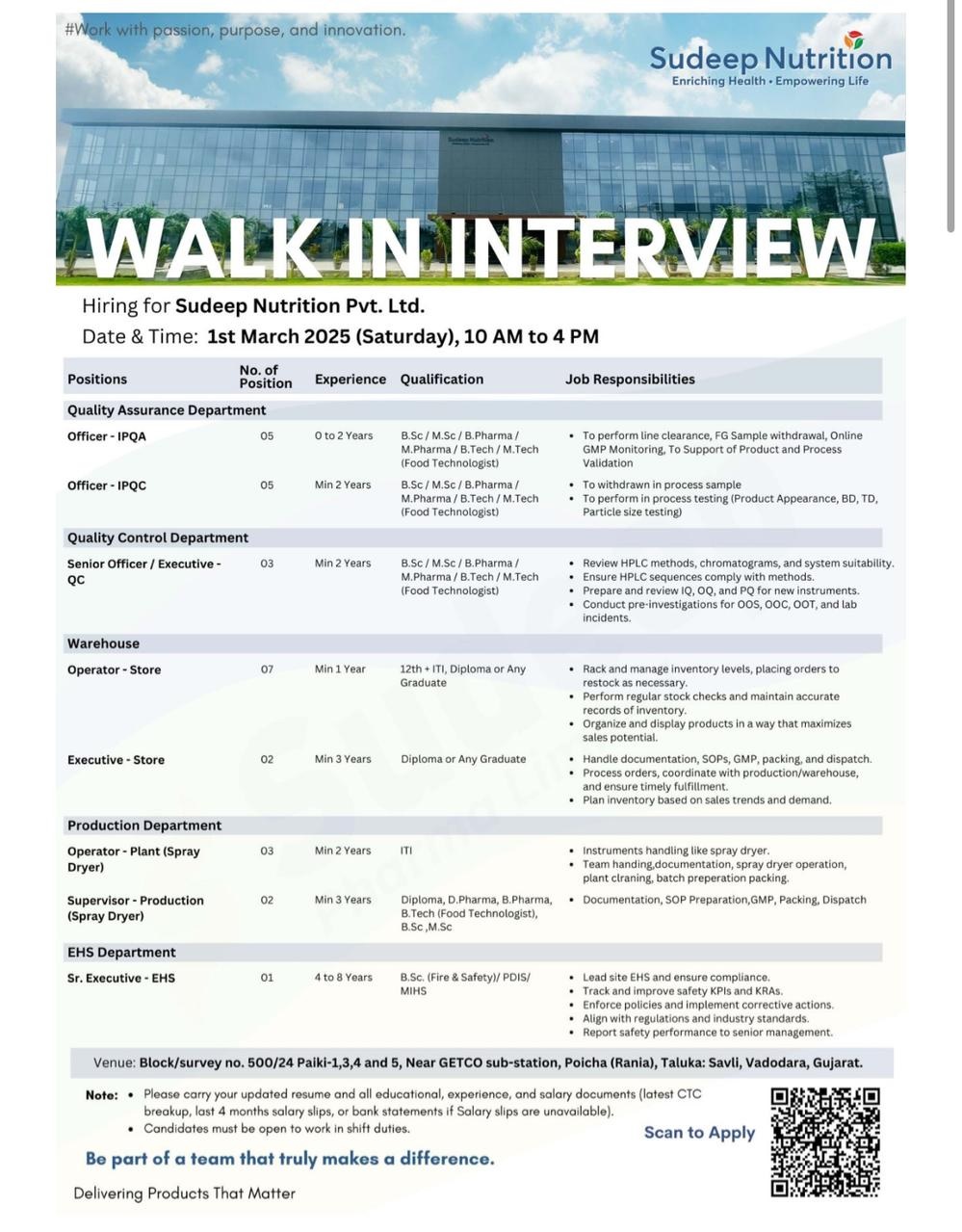 Join Our Growing Team at Sudeep Nutrition. We are excited to announce a Walk-In Interview for multiple roles across Quality Assurance, Quality Control, Production, Warehouse, and EHS departments.