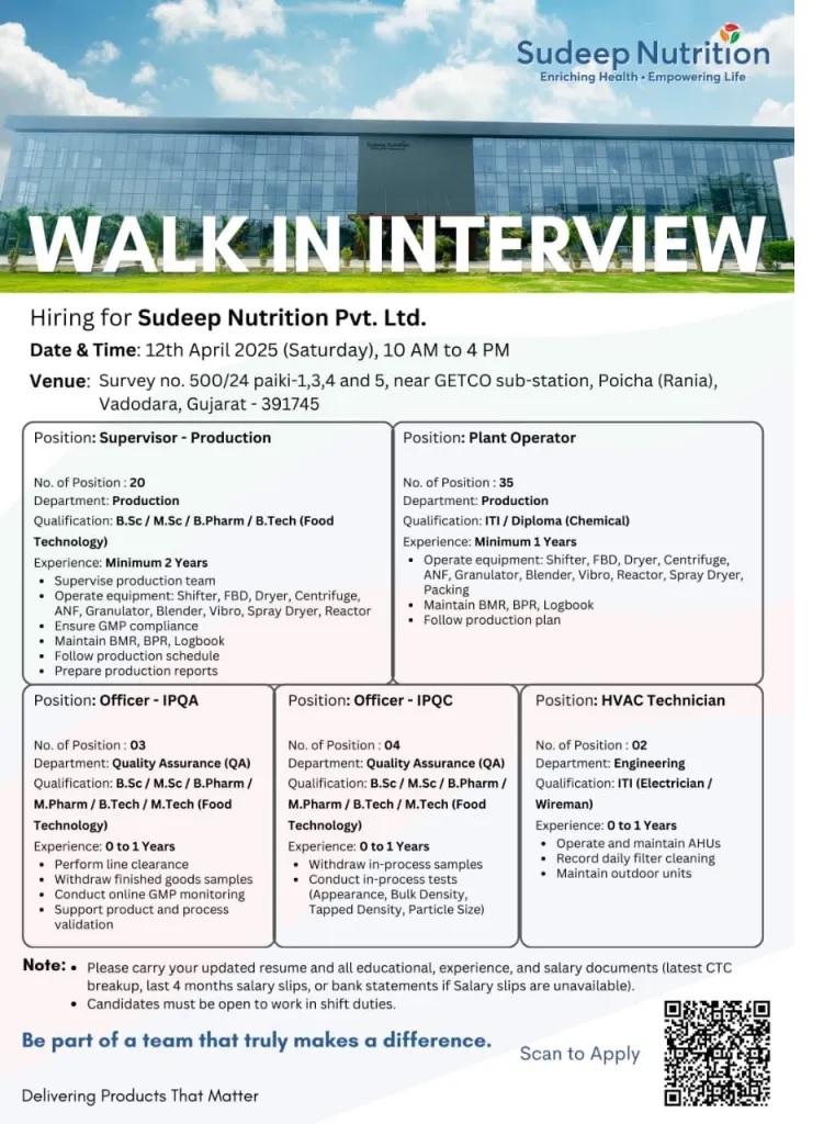 Sudeep Nutritions-Walk-In for Production, IPQA/IPQC, HVAC Technician & Plant Operator Roles on 12 April 2025