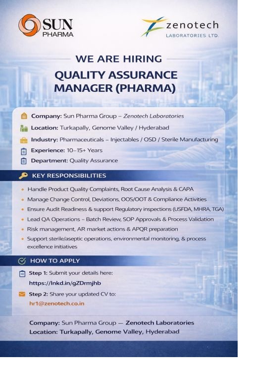 Sun Pharma Group – Zenotech Laboratories Limited Hiring Quality Assurance Manager (Pharma) Sun Pharma Group – Zenotech Laboratories Limited Hiring Quality Assurance Manager (Pharma) Post Views: 2 Job Category: Pharma Job Type: Full Time Job Location: Hyderabad Apply for this position Full Name *Email *Phone *Cover Letter *Upload CV/Resume *Allowed Type(s): .pdf, .doc, .docxBy using this form you agree with the storage and handling of your data by this website. *