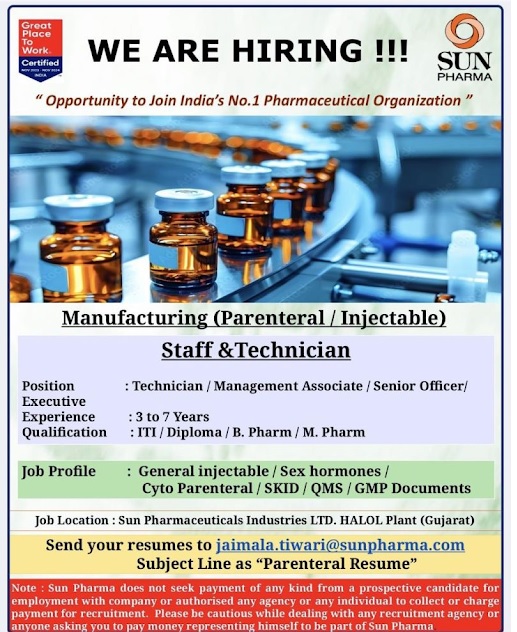 Sun Pharma- Hiring For Manufacturing( Parenteral/ Injectable) Sun Pharma- Hiring For Manufacturing( Parenteral/ Injectable) Post Views: 668 Job Category: Pharma Job Type: Full Time Job Location: Gujarat Apply for this position Full Name *Email *Phone *Cover Letter *Upload CV/Resume *Allowed Type(s): .pdf, .doc, .docxBy using this form you agree with the storage and handling of your data by this website. *