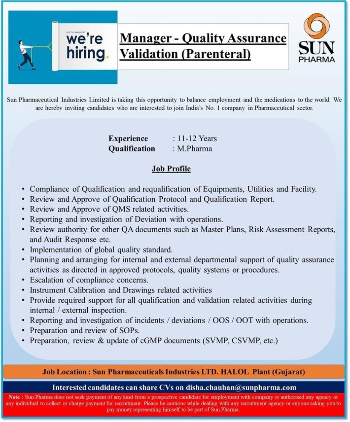 Sun Pharma -Hiring For Quality Assurance Dept Sun Pharma -Hiring For Quality Assurance Dept Interested candidates can share CVs on [email protected] Post Views: 592 Job Category: Pharma Job Type: Full Time Job Location: HALOL Plant (Gujarat) Apply for this position Full Name *Email *Phone *Cover Letter *Upload CV/Resume *Allowed Type(s): .pdf, .doc, .docxBy using this form you agree with the storage and handling of your data by this website. *