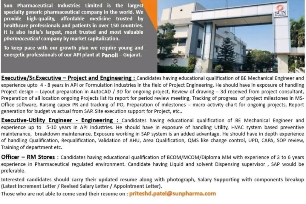 Sun Pharma-Hiring for Project Engineers, Utility Engineers & RM Stores Officers @Gujarat Sun Pharma-Hiring for Project Engineers, Utility Engineers & RM Stores Officers @Gujarat Shop – Post Views: 1,062 Job Category: Pharma Job Type: Full Time Job Location: Gujarat panoli Apply for this position Full Name *Email *Phone *Cover Letter *Upload CV/Resume *Allowed Type(s): .pdf, .doc, .docxBy using this form you agree with the storage and handling of your data by this website. *
