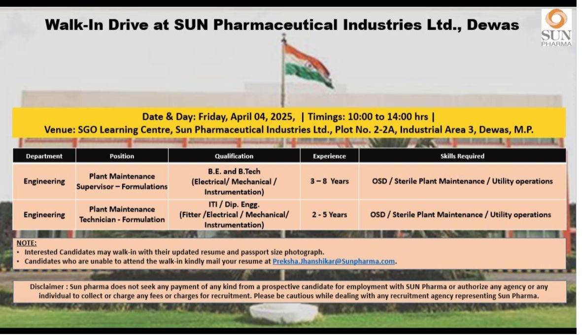 Sun Pharma Industries -Walk In Interview On 4th April 2025