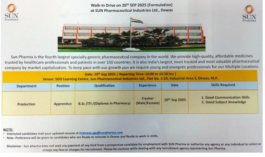 SUN PHARMA Walk-In Drive on 20th SEP 2025