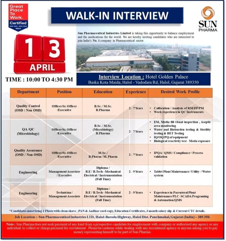 Sun Pharma- Walk-In Drive for Quality Control, QA, Microbiology & Engineering13th April 2025@Halol, Gujarat