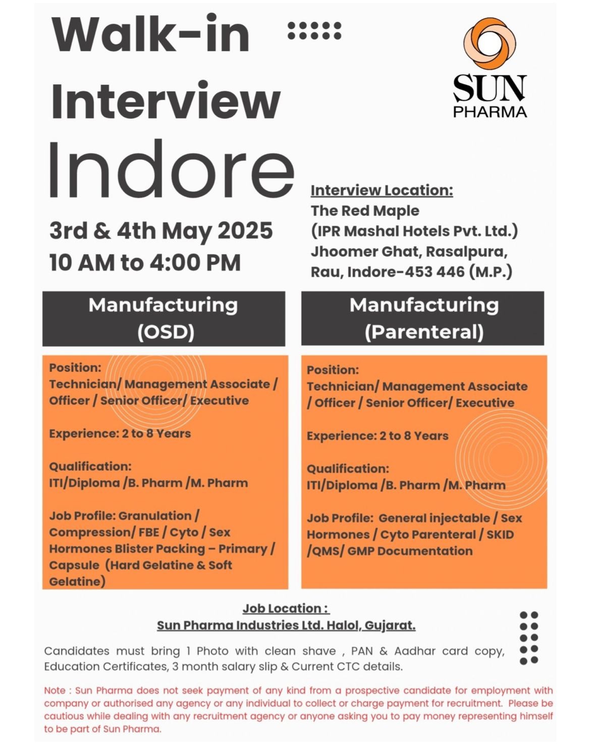 Job Location : Sun. Pharma industries Ltd, Halol, Gujarat