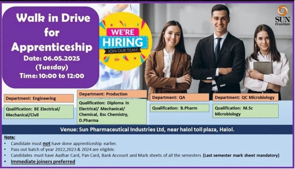 In a golden opportunity for fresh graduates and diploma holders, Sun Pharmaceutical Industries Ltd. is organizing a Walk-In Drive for Apprenticeship on Tuesday, May 6, 2025, from 10:00 AM to 12:00 PM at their Halol facility, located near the Halol toll plaza.