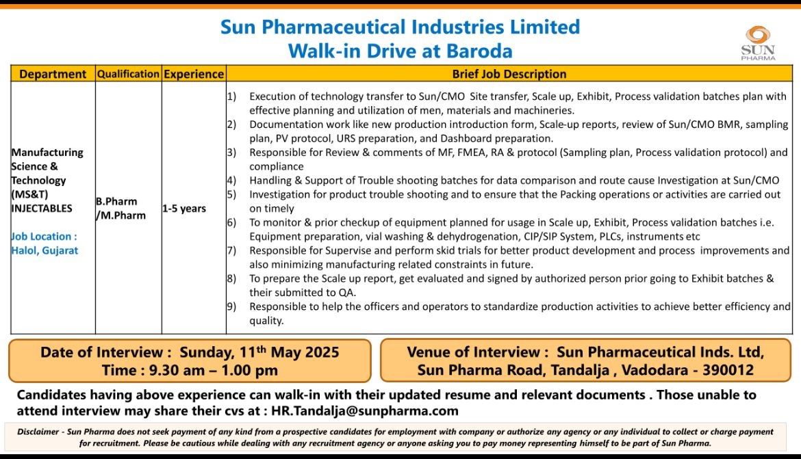 Sun Pharma- Walk In Drive for Manufacturing Science & Technology (MS&T) – Injectable on 11th May 2025 @Baroda Sun Pharma- Walk In Drive for Manufacturing Science & Technology (MS&T) – Injectable on 11th May 2025 @Baroda Post Views: 397 Job Category: Pharma Job Type: Full Time Job Location: baroda Apply for this position Full Name *Email *Phone *Cover Letter *Upload CV/Resume *Allowed Type(s): .pdf, .doc, .docxBy using this form you agree with the storage and handling of your data by this website. *