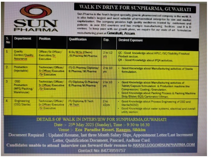 Sun Pharma-Walk-In Drive for Multiple Roles on 25th May 2025 @Guwahati
