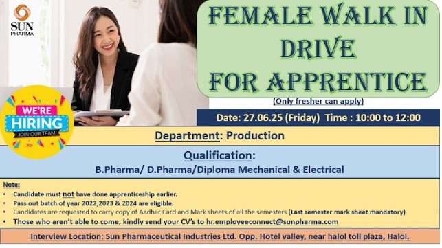 Sun Pharma-Walk-In Drive for Apprentice – Female on 27 June 2025