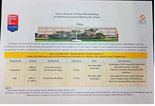 Walk-In Drive on 17th May 2025 (Saturday) at SUN Pharmaceutical Industries Ltd., Dewas