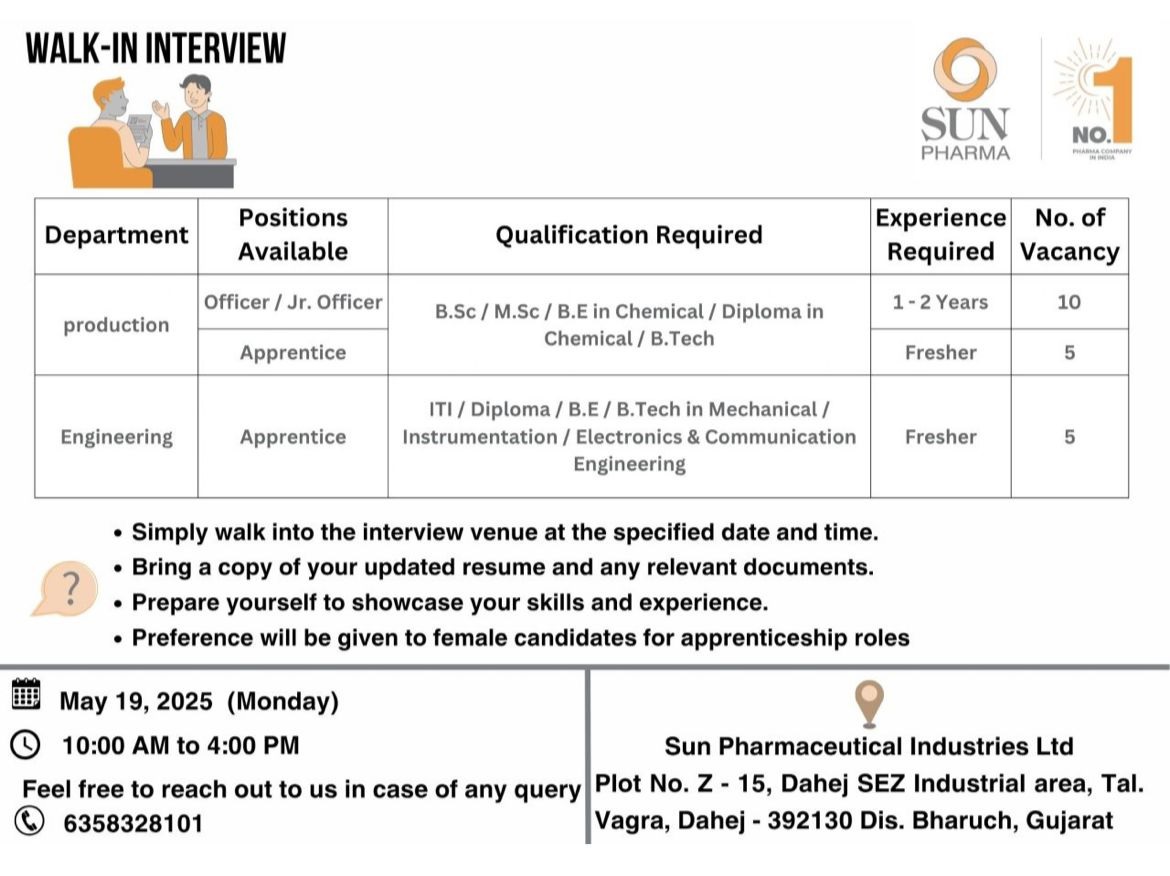 Sun Pharma -Walk In Interview For Production and Engineering on May 19, 2025 Sun Pharma -Walk In Interview For Production and Engineering on May 19, 2025 Post Views: 1,082 Job Category: Pharma Job Type: Full Time Job Location: Dahej Apply for this position Full Name *Email *Phone *Cover Letter *Upload CV/Resume *Allowed Type(s): .pdf, .doc, .docxBy using this form you agree with the storage and handling of your data by this website. *