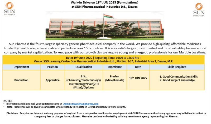 Sun Pharma -Walk-In Interview For Production on 19th June 2025