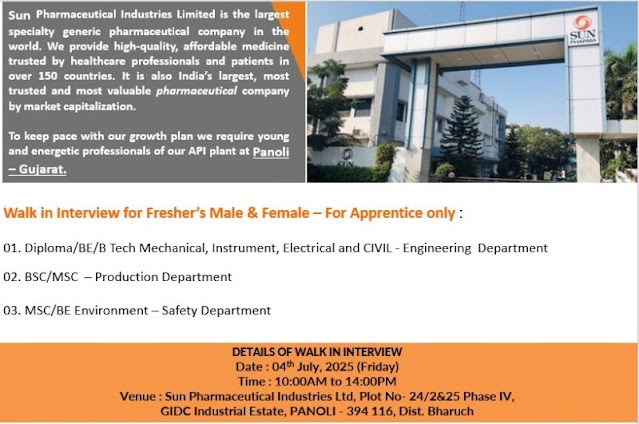 Sun Pharma- Walk-In Interview For Freshers (Male & Female) on 04 July 2025