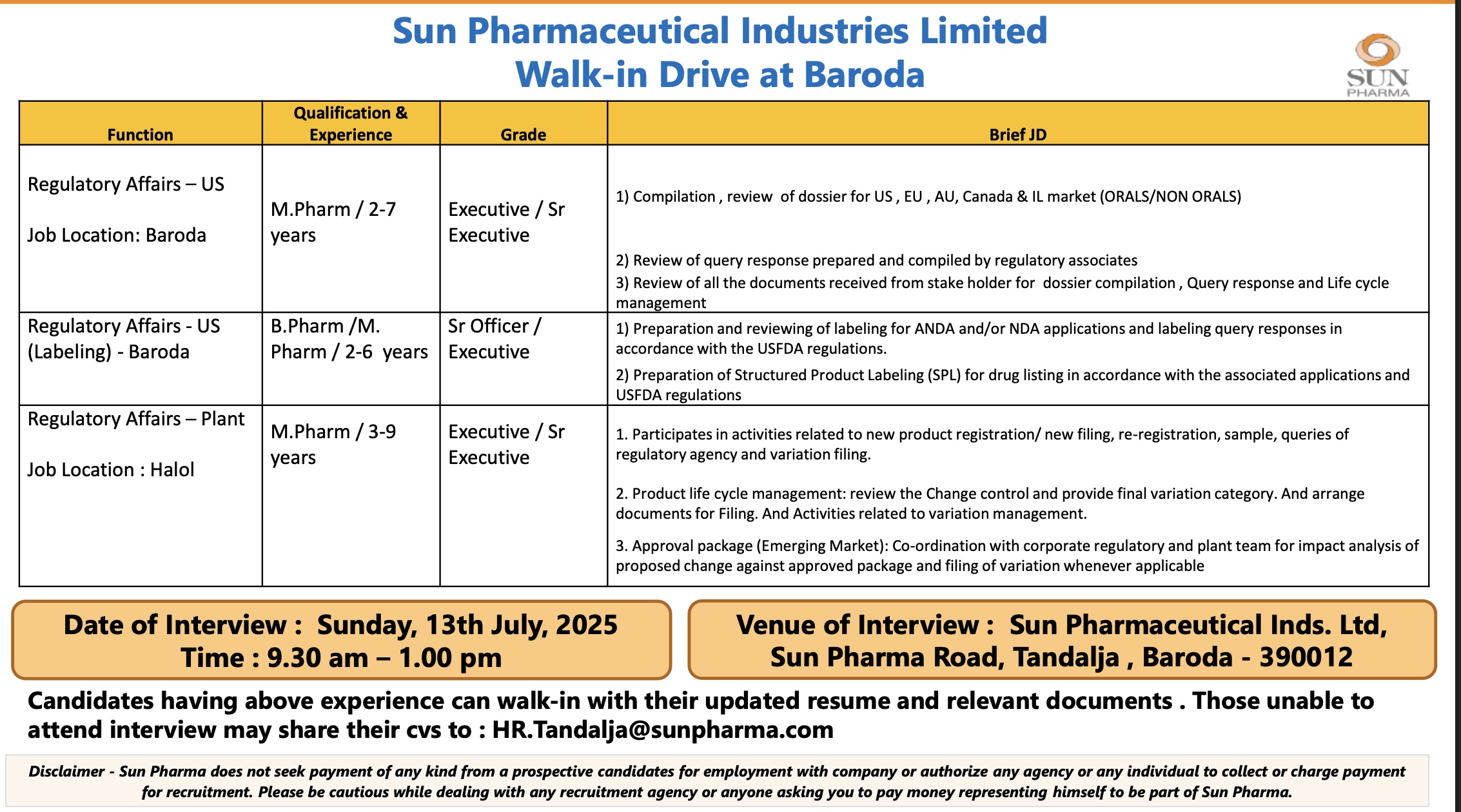 Sun Pharma -Walk-In Interview For Regulatory Affairs on 13th July 2025
