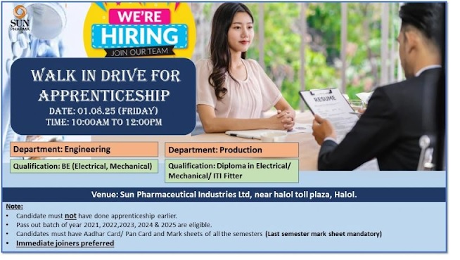 Sun Pharma -Walk In interview for Apprenticeship on 1st Aug 2025