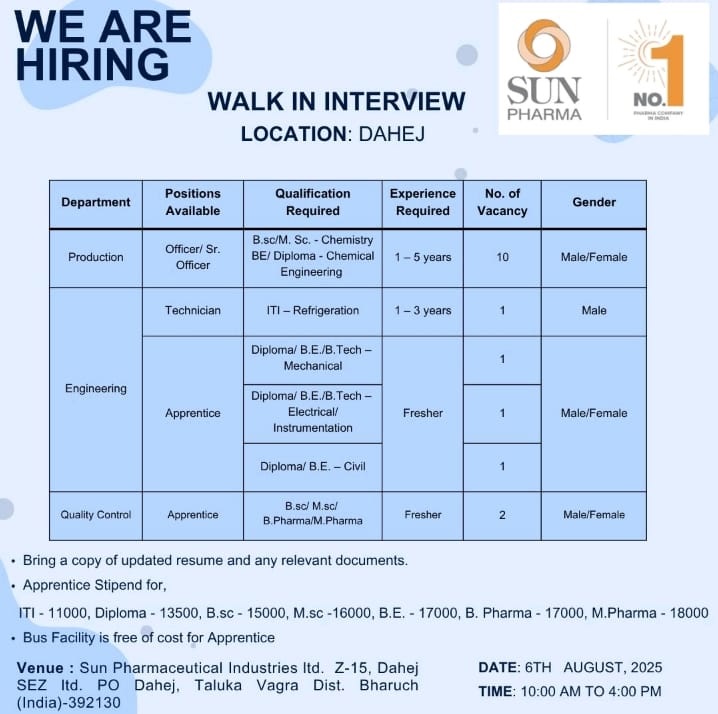 Sun Pharma- Walk in Interview for Production Engineering &Quality Control On 6th August 2025 @Dahej – Bharuch