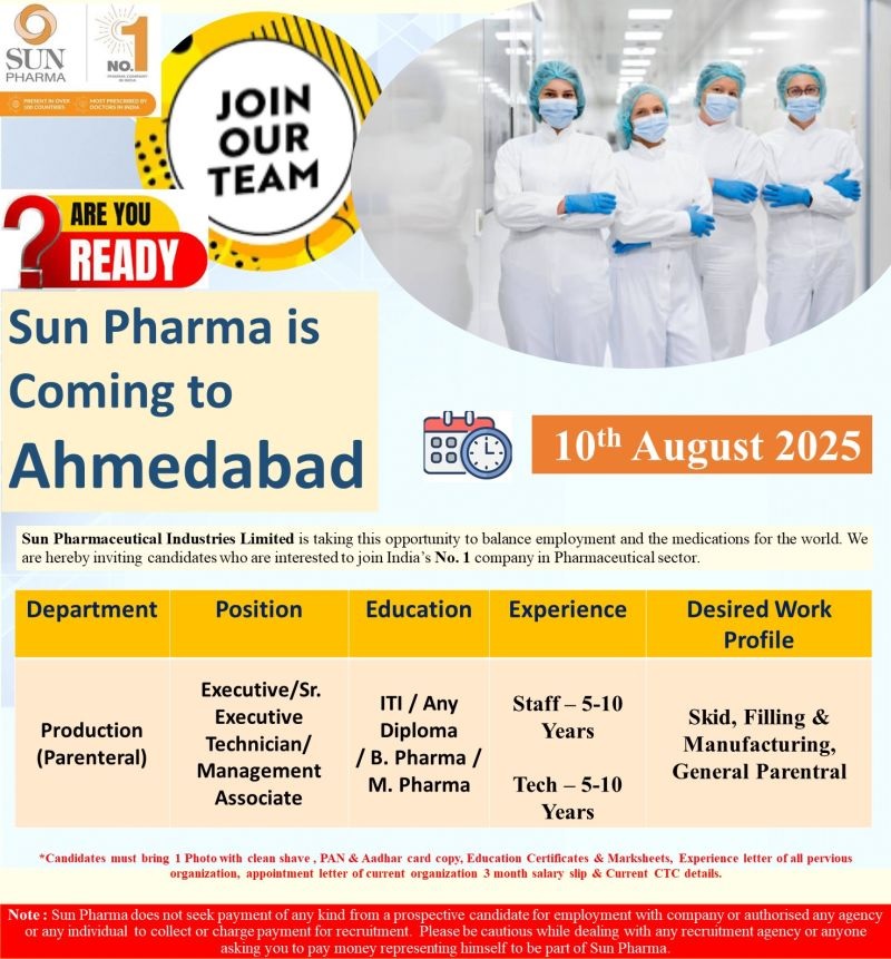 Sun Pharma- Walk-In Interview For Production on 10th August 2025 @ Ahmedabad Sun Pharma- Walk-In Interview For Production on 10th August 2025 @ Ahmedabad Post Views: 385 Job Category: Pharma Job Type: Full Time Job Location: Ahmedabad Apply for this position Full Name *Email *Phone *Cover Letter *Upload CV/Resume *Allowed Type(s): .pdf, .doc, .docxBy using this form you agree with the storage and handling of your data by this website. *