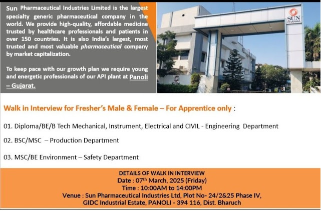 Sun Pharma- Walk in Interview for Fresher’s Male & Female – For Apprentice on 7th March, 2025