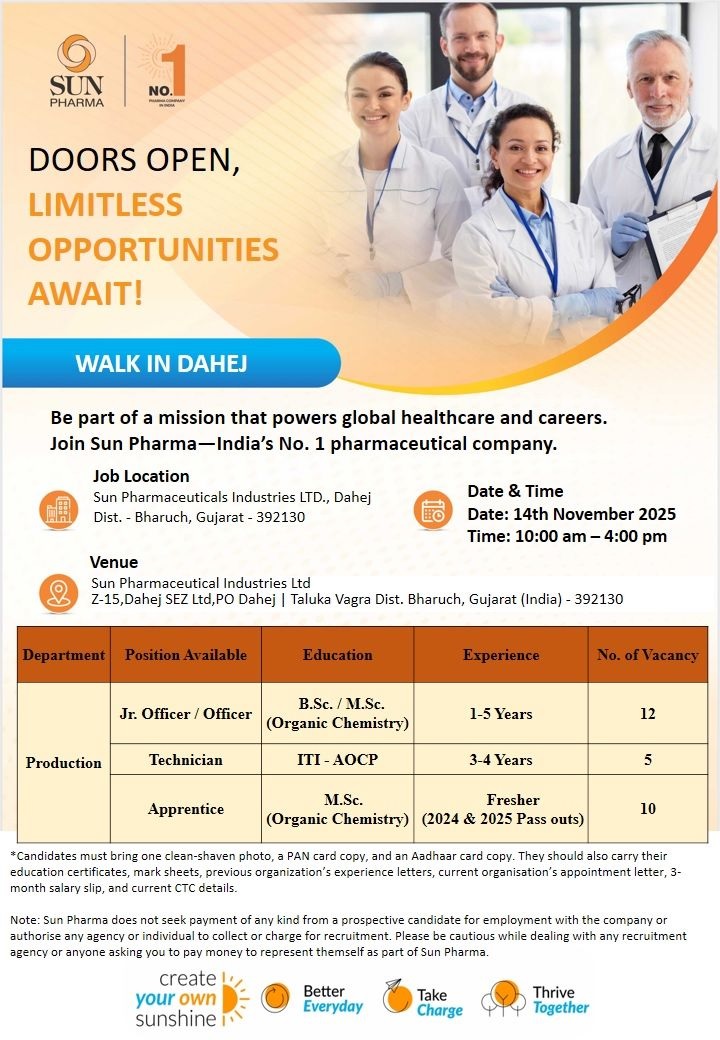 Sun Pharma-Walk In Interview For Fresher & Experienced Production on 14th November 2025 Sun Pharma-Walk In Interview For Fresher & Experienced Production on 14th November 2025 Post Views: 368 Job Category: Pharma Job Type: Full Time Job Location: Dahej Apply for this position Full Name *Email *Phone *Cover Letter *Upload CV/Resume *Allowed Type(s): .pdf, .doc, .docxBy using this form you agree with the storage and handling of your data by this website. *