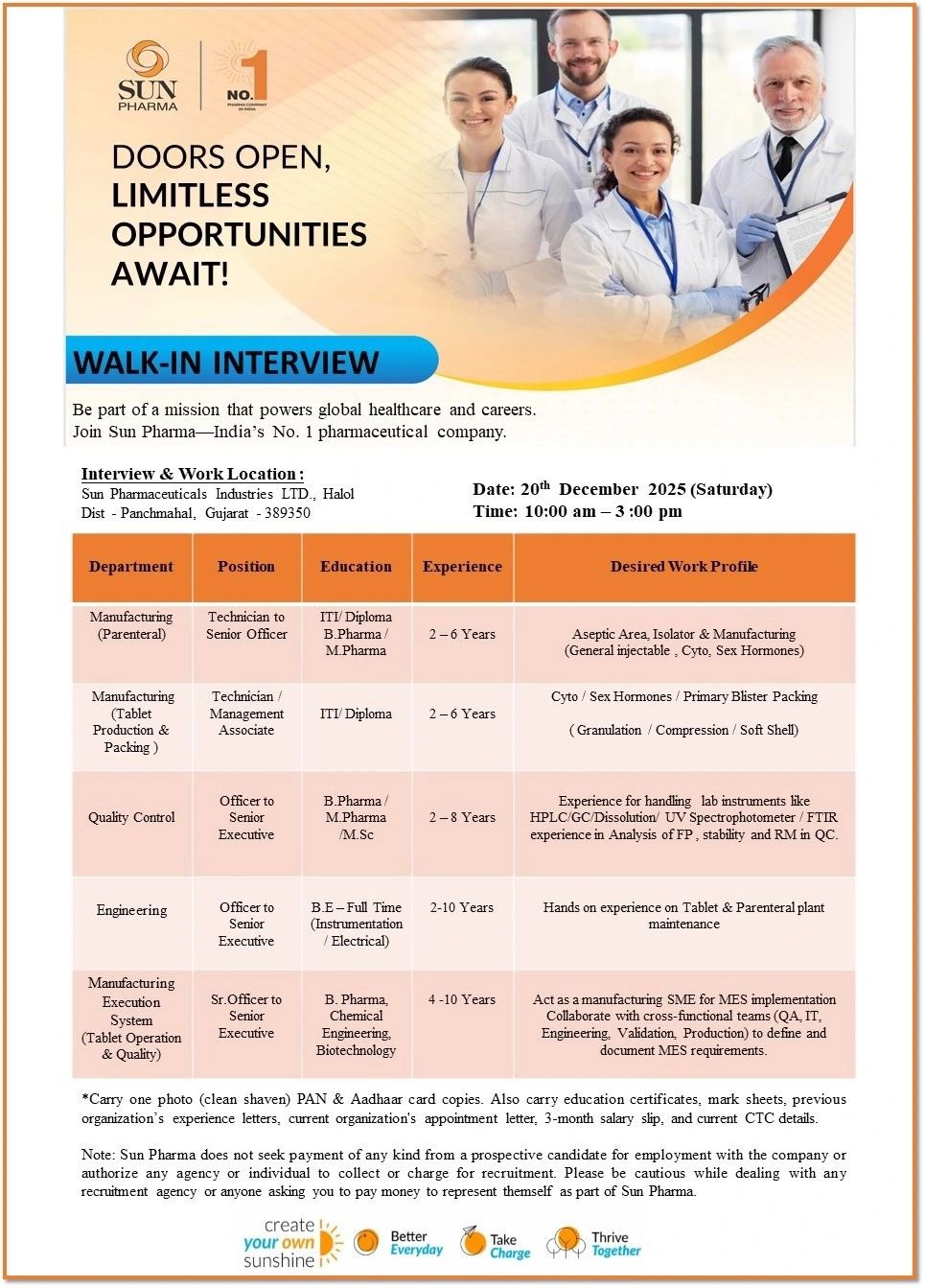 Sun Pharma -Walk-In Interview for Manufacturing, QC & Engineering on 20th December 2025