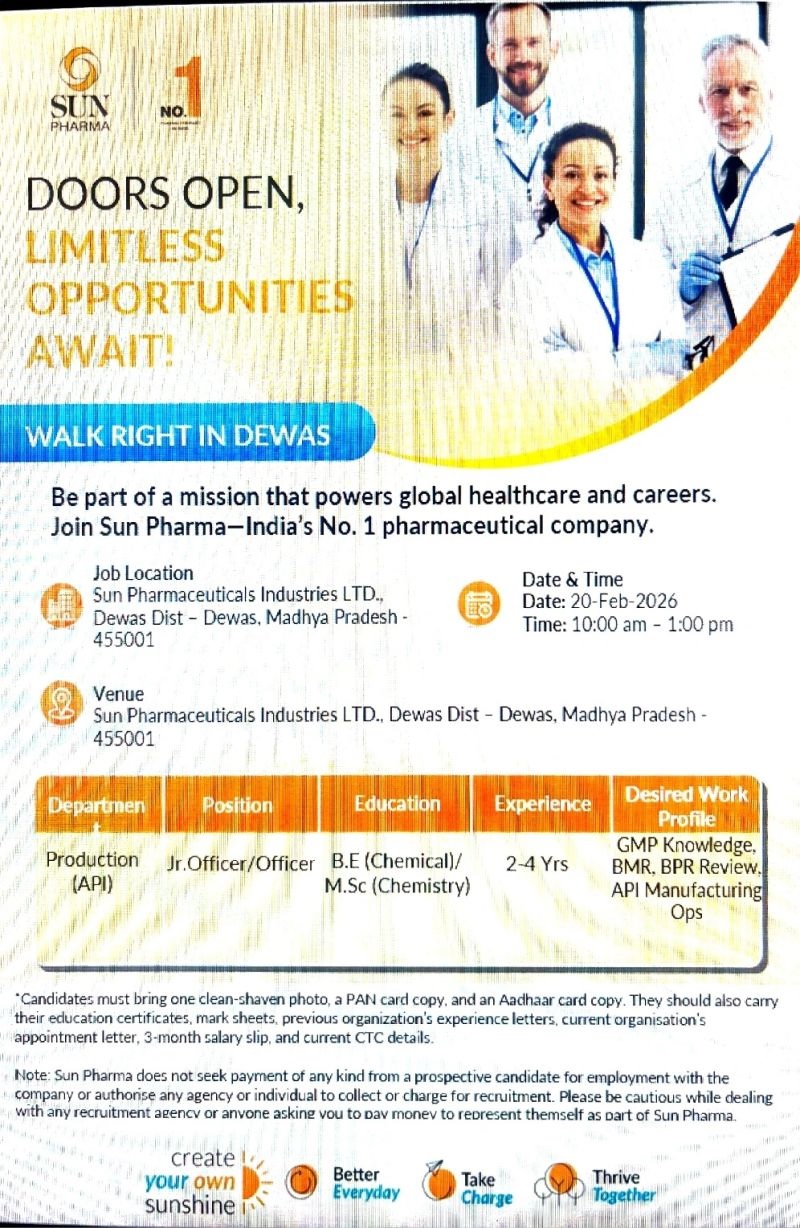 Sun Pharmaceutical Industries Ltd, India’s No.1 pharmaceutical company, is conducting a Walk-In Interview in Dewas, Madhya Pradesh for API Production roles.