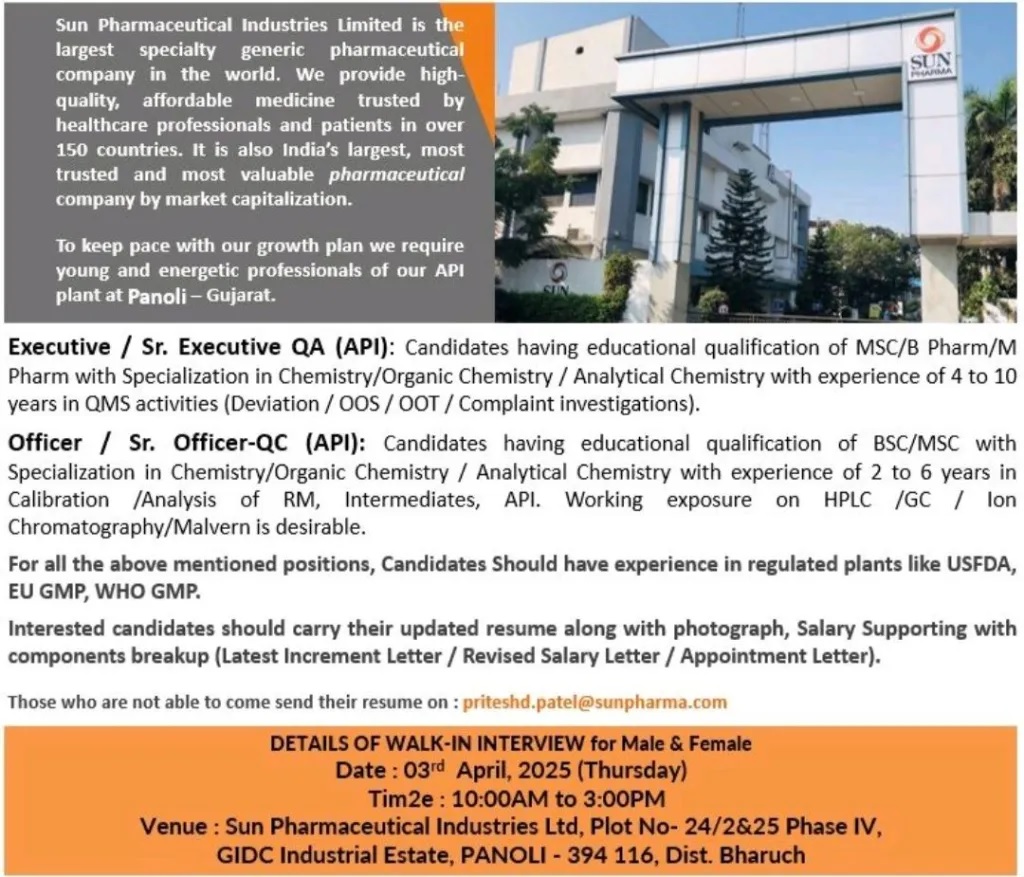 Sun Pharma-Walk-in Interview for QA & QC Roles API Plant on 3rd April 2025@Panoli, Gujarat Sun Pharma-Walk-in Interview for QA & QC Roles API Plant on 3rd April 2025@Panoli, Gujarat Post Views: 1,334 Job Category: Pharma Job Type: Full Time Job Location: panoli Apply for this position Full Name *Email *Phone *Cover Letter *Upload CV/Resume *Allowed Type(s): .pdf, .doc, .docxBy using this form you agree with the storage and handling of your data by this website. *