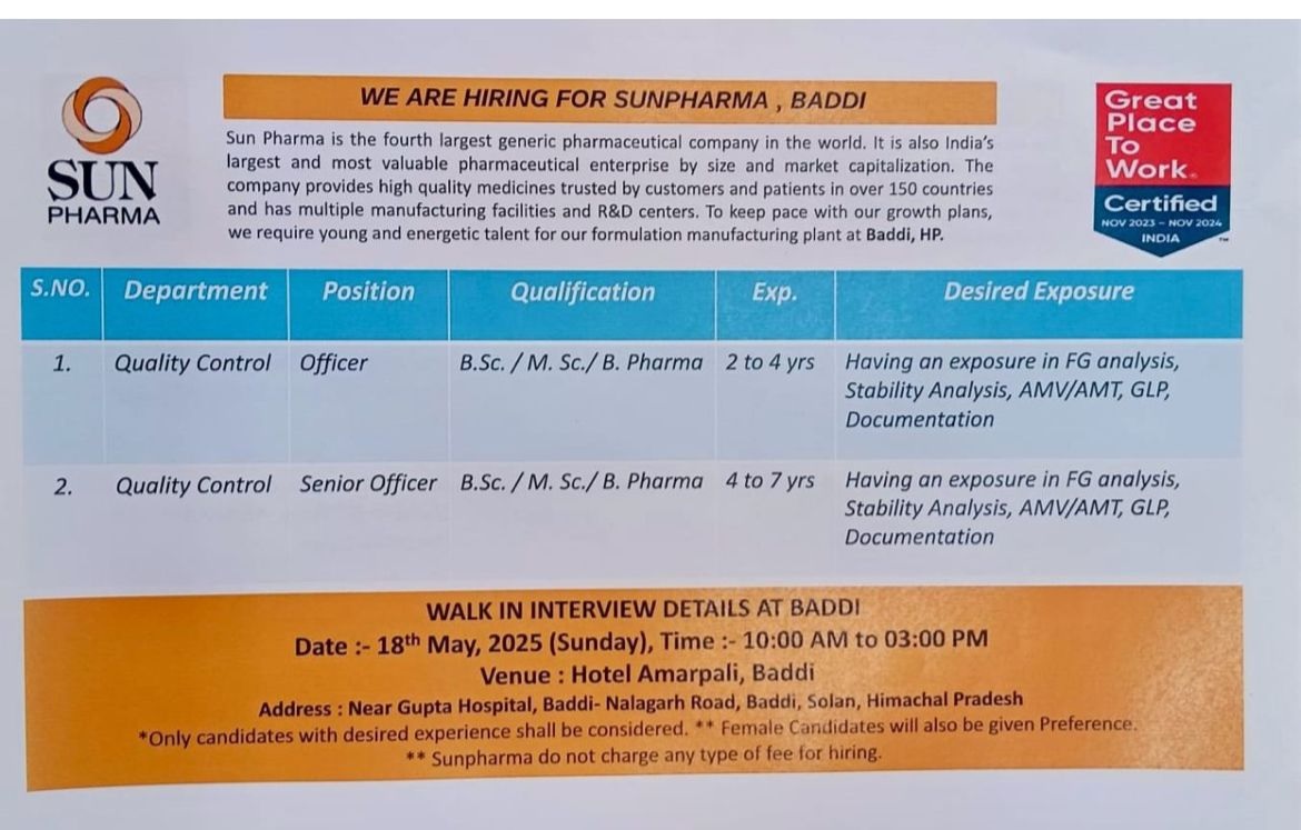 WE ARE HIRING FOR SUNPHARMA, BADDI