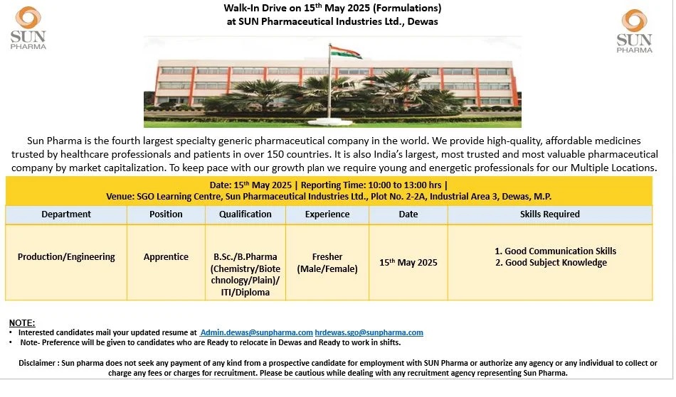 Sun Pharma – Walk-in interview for Freshers on 15th May 2025