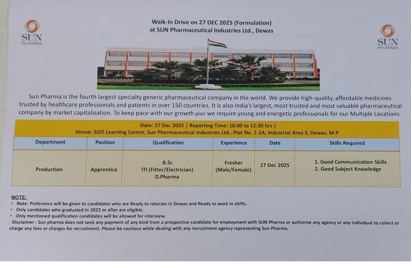 Sun Pharma-Walk in Interview for Production Apprentice on 27 Dec 2025