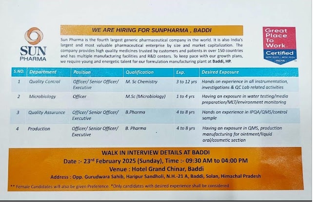 WE ARE HIRING FOR SUN PHARMA, BADDI