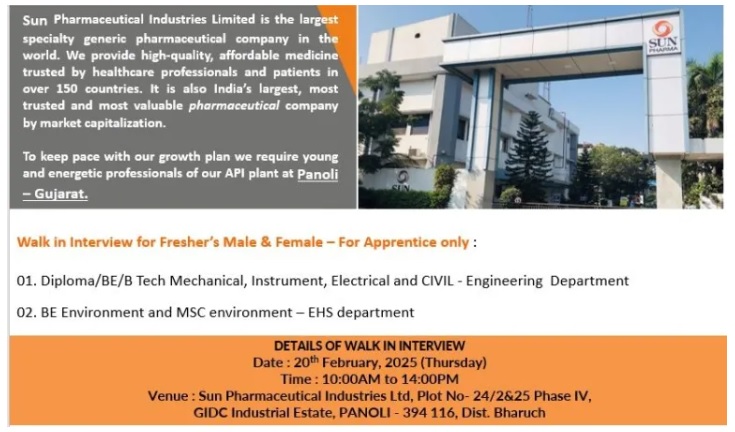 Sun Pharmaceutical Industries Limited-Walk in Interview for Fresher’s Male & Female – For Apprentice on 20th February, 2025 Sun Pharmaceutical Industries Limited is the largest specialty generic pharmaceutical company in the world. We provide high-quality, affordable medicine trusted by healthcare professionals and patients in over 150 countries. It is also India’s largest, most trusted and most valuable pharmaceutical company by market capitalization. To keep pace with our growth plan we require young and energetic professionals of our API plant at Panoli – Gujarat. Walk in Interview for Fresher’s Male & Female – For Apprentice only: 01. Diploma/BE/B Tech Mechanical, Instrument, Electrical and CIVIL – Engineering Department 02. BE Environment and MSC environment – EHS department DETAILS OF WALK IN INTERVIEW Date: 20th February, 2025 (Thursday) Time: 10:00AM to 14:00PM Venue: Sun Pharmaceutical Industries Ltd, Plot No- 24/2&25 Phase IV, GIDC Industrial Estate, PANOLI – 394 116, Dist. Bharuch SUN