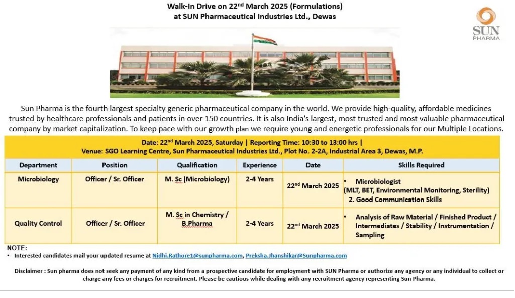 Walk-In Drive on 22nd March 2025 (Formulations) at SUN Pharmaceutical Industries Ltd., Dewas