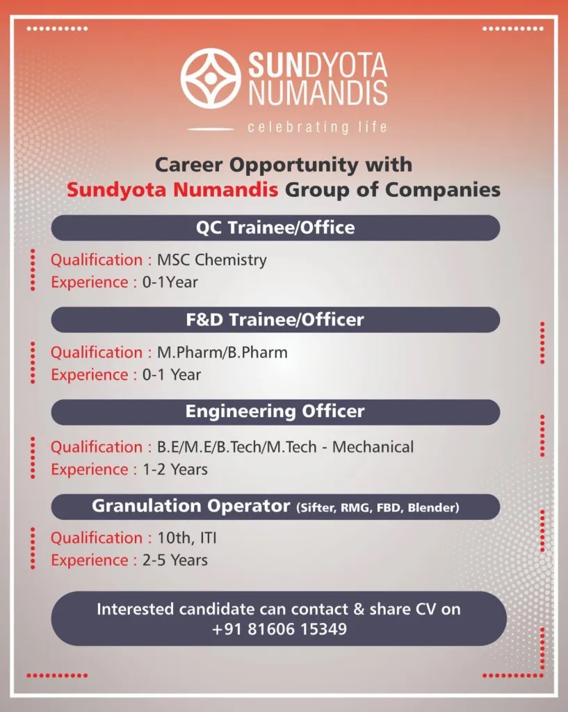 Sundyota Numandis- Hiring Freshers & Experienced for QC, F&D, Engineering, Granulation Apply Sundyota Numandis- Hiring Freshers & Experienced for QC, F&D, Engineering, Granulation Apply Post Views: 532 Job Category: Pharma Job Type: Full Time Job Location: Ahmedabad Apply for this position Full Name *Email *Phone *Cover Letter *Upload CV/Resume *Allowed Type(s): .pdf, .doc, .docxBy using this form you agree with the storage and handling of your data by this website. *