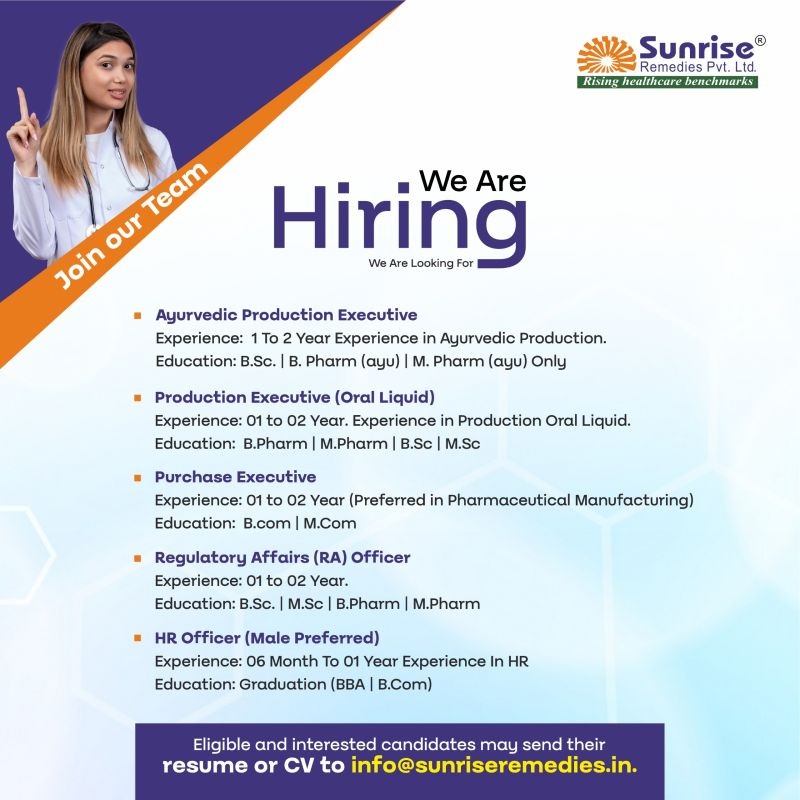 Sunrise Remedies- Hiring For Production, Purchase, Regulatory Affairs & HR Dept Sunrise Remedies- Hiring For Production, Purchase, Regulatory Affairs & HR Dept Post Views: 252 Job Category: Pharma Job Type: Full Time Job Location: Hyderabad Apply for this position Full Name *Email *Phone *Cover Letter *Upload CV/Resume *Allowed Type(s): .pdf, .doc, .docxBy using this form you agree with the storage and handling of your data by this website. *