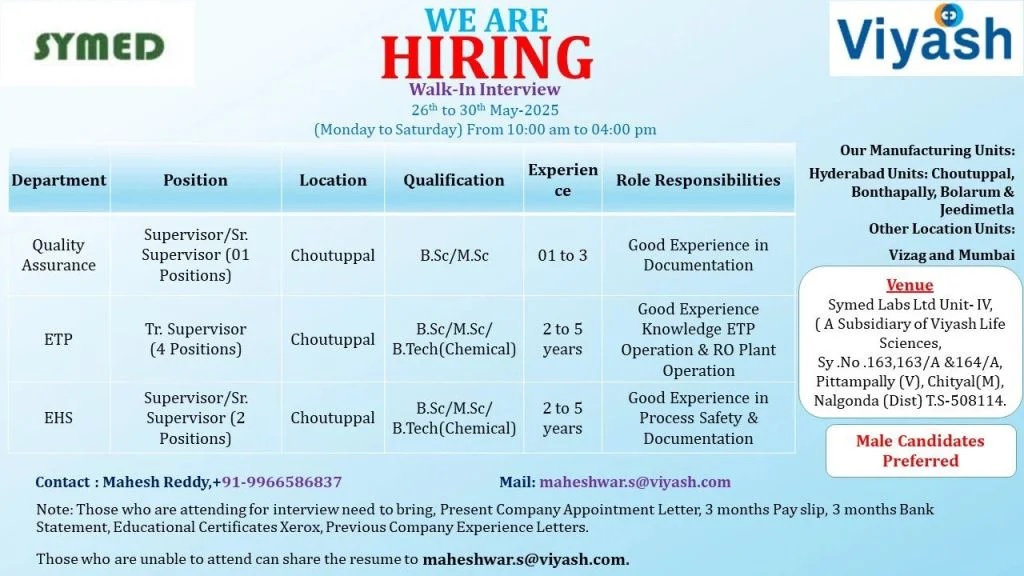 Symed Labs Ltd – Walk-in interview for QA, EHS, ETP on 26th – 30th May 2025