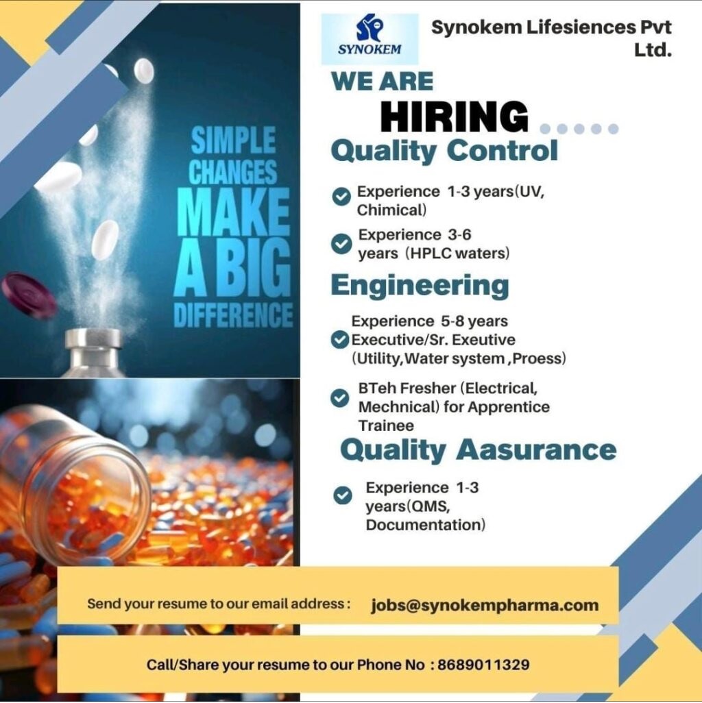 Synokem Lifesciences Pvt Ltd -Openings in QC, QA, and Engineering Departments Synokem Lifesciences Pvt Ltd -Openings in QC, QA, and Engineering Departments Post Views: 151 Job Category: Pharma Job Type: Full Time Job Location: Baddi Apply for this position Full Name *Email *Phone *Cover Letter *Upload CV/Resume *Allowed Type(s): .pdf, .doc, .docxBy using this form you agree with the storage and handling of your data by this website. *