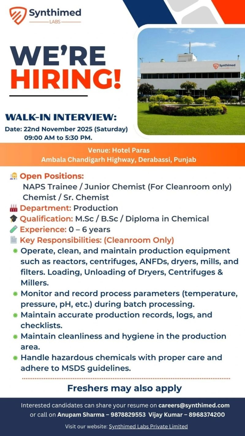 Synthimed Labs -Walk in For Production Departments Freshers & Experienced on 22nd November 2025 Synthimed Labs -Walk in For Production Departments Freshers & Experienced on 22nd November 2025 Post Views: 172 Job Category: Pharma Job Type: Full Time Job Location: Derabassi Apply for this position Full Name *Email *Phone *Cover Letter *Upload CV/Resume *Allowed Type(s): .pdf, .doc, .docxBy using this form you agree with the storage and handling of your data by this website. *