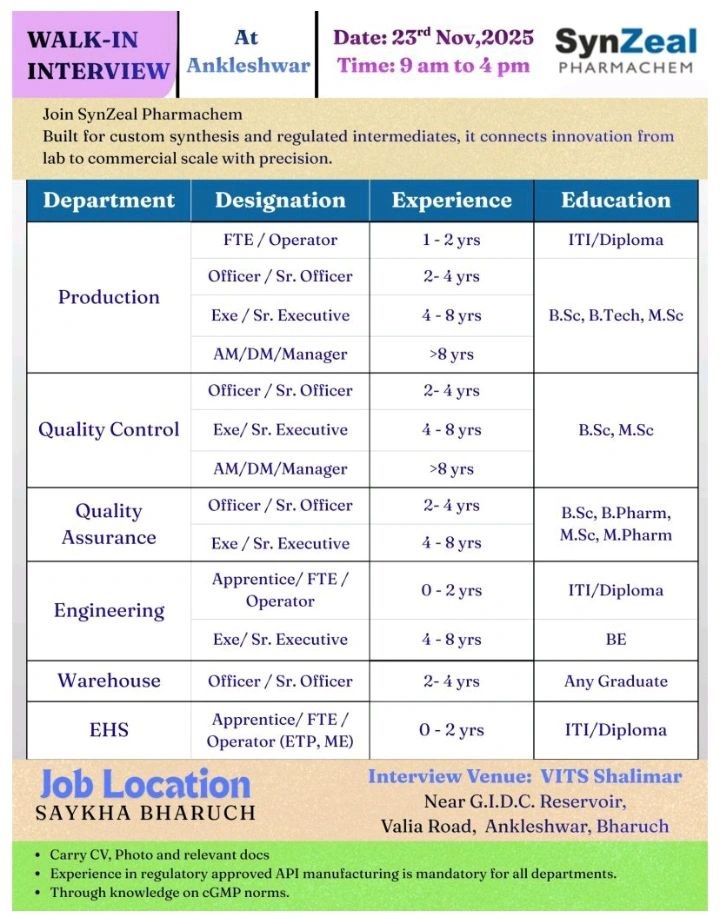SynZeal Pharmachem- Walk‑In Interview for Production, QC, QA, Engineering, EHS & Warehouse on 23rd Nov 2025 SynZeal Pharmachem- Walk‑In Interview for Production, QC, QA, Engineering, EHS & Warehouse on 23rd Nov 2025 Post Views: 333 Job Category: Pharma Job Type: Full Time Job Location: Bharuch Apply for this position Full Name *Email *Phone *Cover Letter *Upload CV/Resume *Allowed Type(s): .pdf, .doc, .docxBy using this form you agree with the storage and handling of your data by this website. *