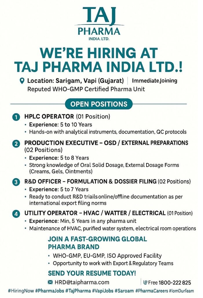 Taj Pharma India Ltd.-Multiple Vacancies @ Sarigam, Vapi (Gujarat) Taj Pharma India Ltd.-Multiple Vacancies @ Sarigam, Vapi (Gujarat) Post Views: 140 Job Category: Pharma Job Type: Full Time Job Location: Sarigam Apply for this position Full Name *Email *Phone *Cover Letter *Upload CV/Resume *Allowed Type(s): .pdf, .doc, .docxBy using this form you agree with the storage and handling of your data by this website. *