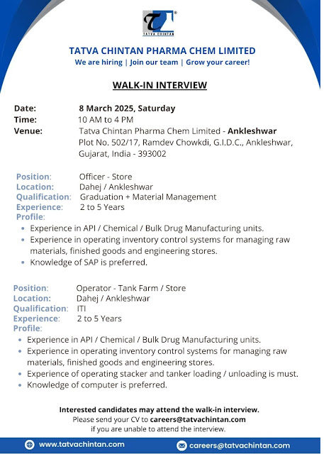 Tatva Chintan Pharma Chem- Walk In Interview On 8th March 2025