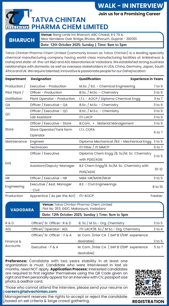 Tatva Chintan- Walk-In Interview for Multiple Openings in Production, QA, QC, R&D, More on 12th October 2025@Bharuch&Vadodara