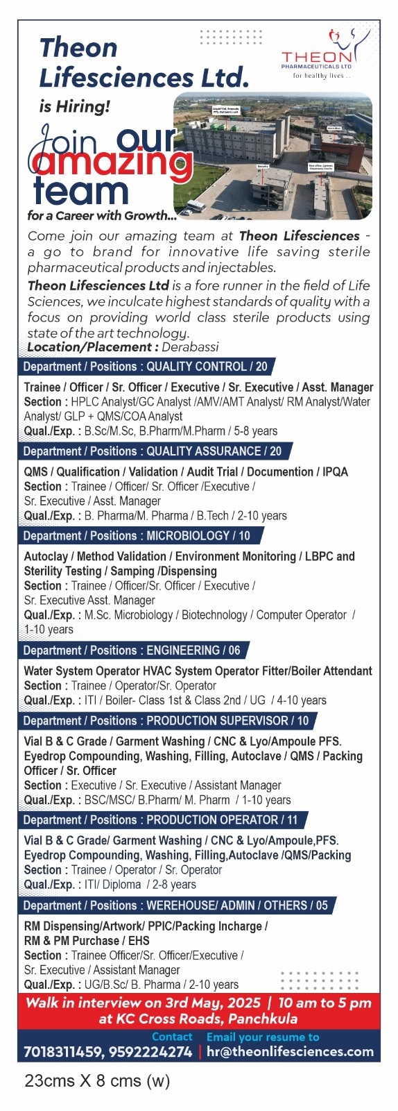 Theon Lifesciences Ltd.-Walk in for multiple position on 3rd May 20252@Panchkula Theon Lifesciences Ltd.-Walk in for multiple position on 3rd May 20252@Panchkula Post Views: 762 Job Category: Pharma Job Type: Full Time Job Location: Baddi Apply for this position Full Name *Email *Phone *Cover Letter *Upload CV/Resume *Allowed Type(s): .pdf, .doc, .docxBy using this form you agree with the storage and handling of your data by this website. *