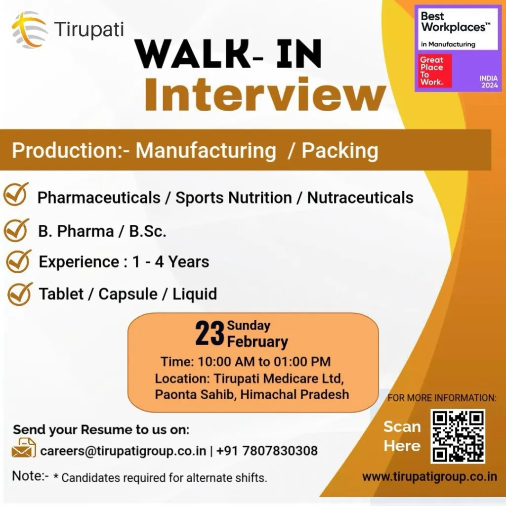 Tirupati-Walk-In for Manufacturing & Packing on 23 Feb 2025 Tirupati-Walk-In for Manufacturing & Packing on 23 Feb 2025 Post Views: 1,429 Job Category: Pharma Job Type: Full Time Job Location: poanta sahib Apply for this position Full Name *Email *Phone *Cover Letter *Upload CV/Resume *Allowed Type(s): .pdf, .doc, .docxBy using this form you agree with the storage and handling of your data by this website. *