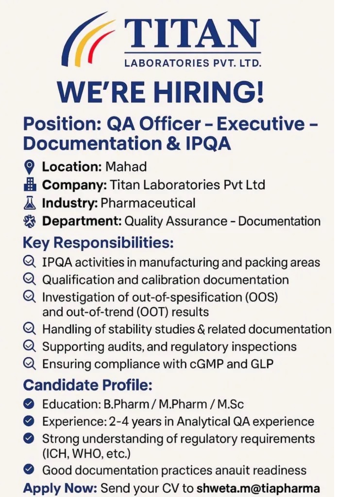 Titan Laboratories-Hiring for QA Department Titan Laboratories-Hiring for QA Department Post Views: 1,394 Job Category: Pharma Job Type: Full Time Job Location: MAHAD (RAIGAD) Apply for this position Full Name *Email *Phone *Cover Letter *Upload CV/Resume *Allowed Type(s): .pdf, .doc, .docxBy using this form you agree with the storage and handling of your data by this website. *