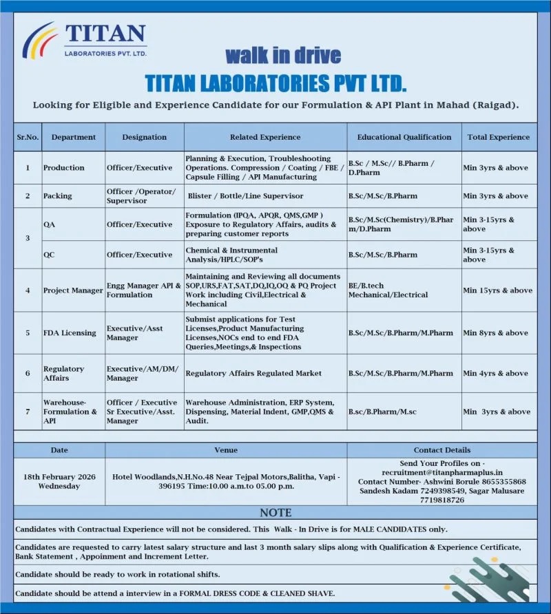 Titan Laboratories Pvt. Ltd. has announced a Walk-In Drive for experienced candidates at its Formulation & API Plant in Mahad (Raigad). Multiple openings are available across Production, QA, QC, Regulatory Affairs, Project Management, and Warehouse departments.