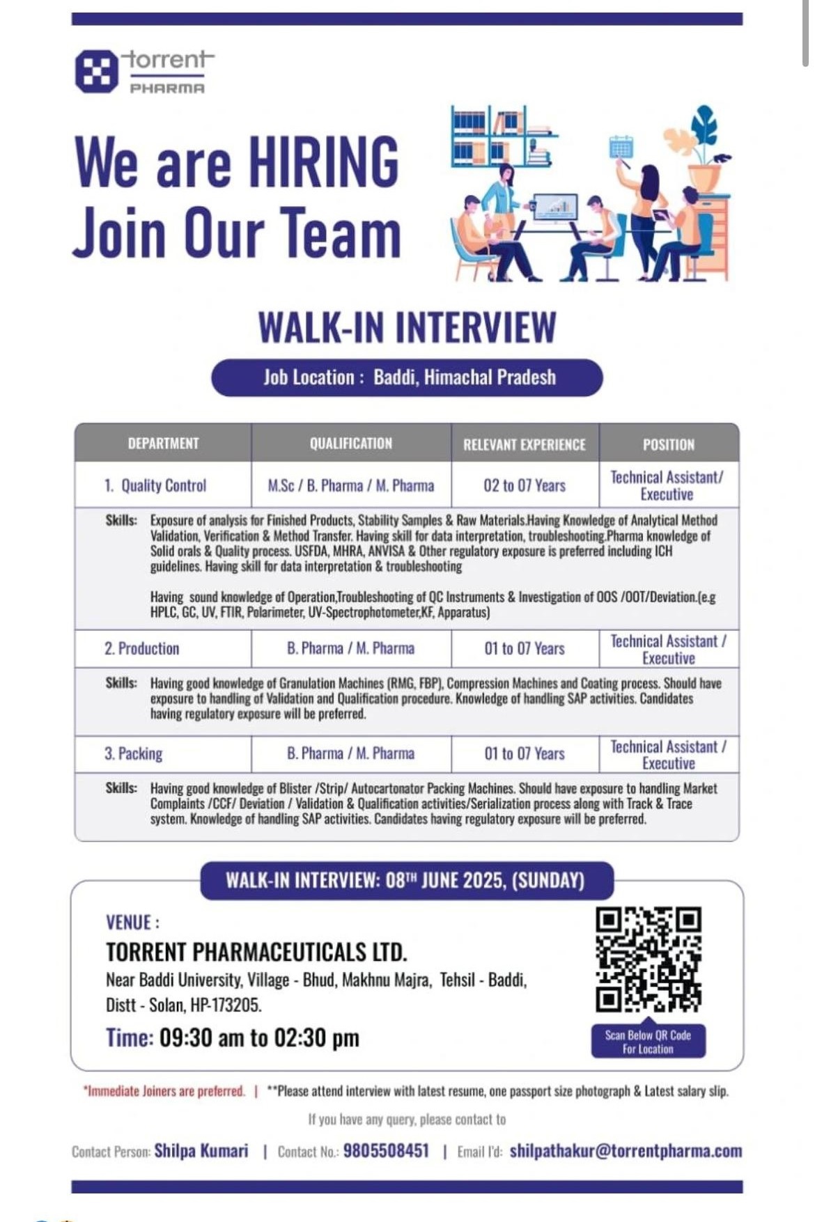 Torrent Pharmaceuticals- Walk-In Interview For QC, Production & Packing on June 8, 2025