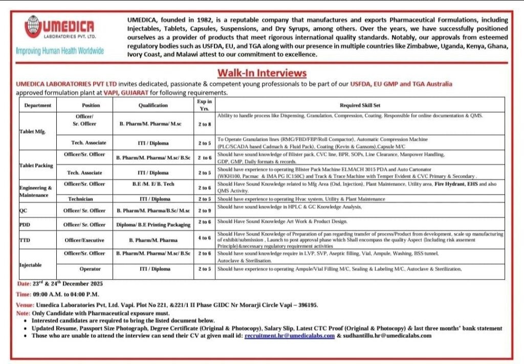 Umedica Laboratories-Walk in for Multiple posts for MPharm, BPharm, MSc on 23rd & 24th December 2025