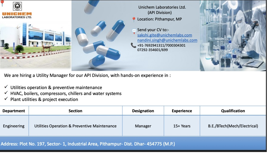 Unichem Laboratories-Hiring For Engineering Dept@ Pithampur,Dhar (M.P.) Unichem Laboratories-Hiring For Engineering Dept@ Pithampur,Dhar (M.P.) Post Views: 384 Job Category: Pharma Job Type: Full Time Job Location: Pithampur (Dhar). Apply for this position Full Name *Email *Phone *Cover Letter *Upload CV/Resume *Allowed Type(s): .pdf, .doc, .docxBy using this form you agree with the storage and handling of your data by this website. *